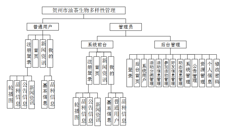 通过对贺州市油茶生物多样性管理的需求分析,该系统主要分为普通用户和管理员两大功能模块。具体如下: