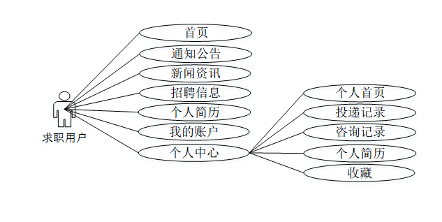 通过2.3功能的分析,得出了本求职推荐系统的用例图:
