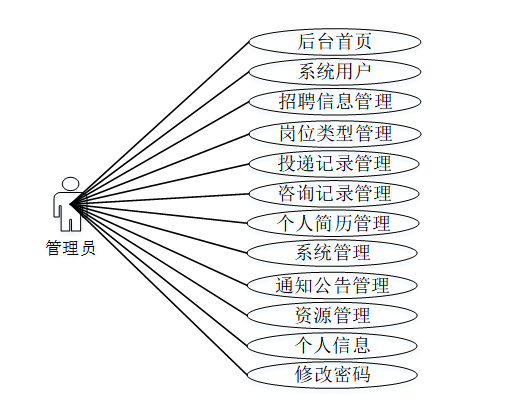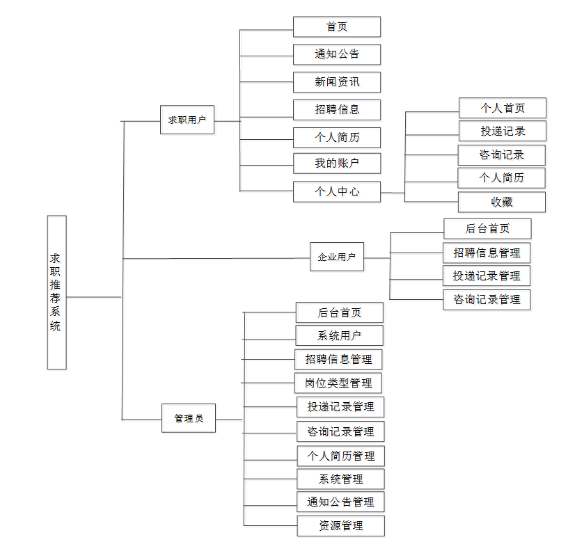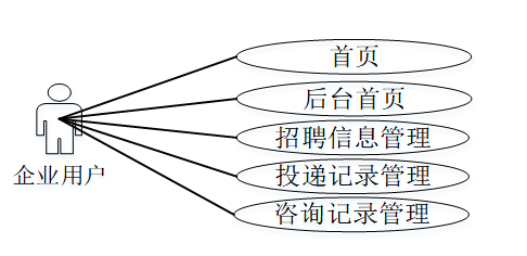 本系统用户权限分为3类,包括求职用户、企业用户和管理员,通过调查分析,系统主要的功能需求如下: