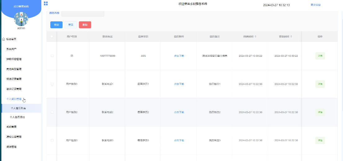 - 个人简历管理:管理员可以查看所有个人简历信息,进行查询和删除操作。