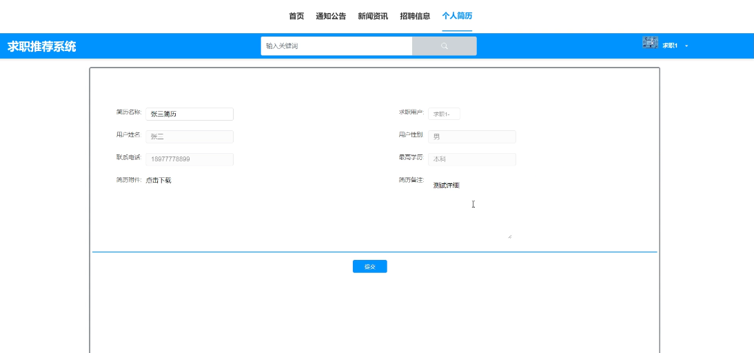 - 个人简历:该模块方便求职用户管理和添加自己的个人简历信息。