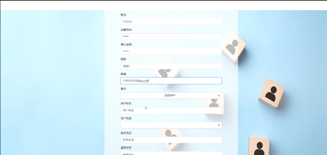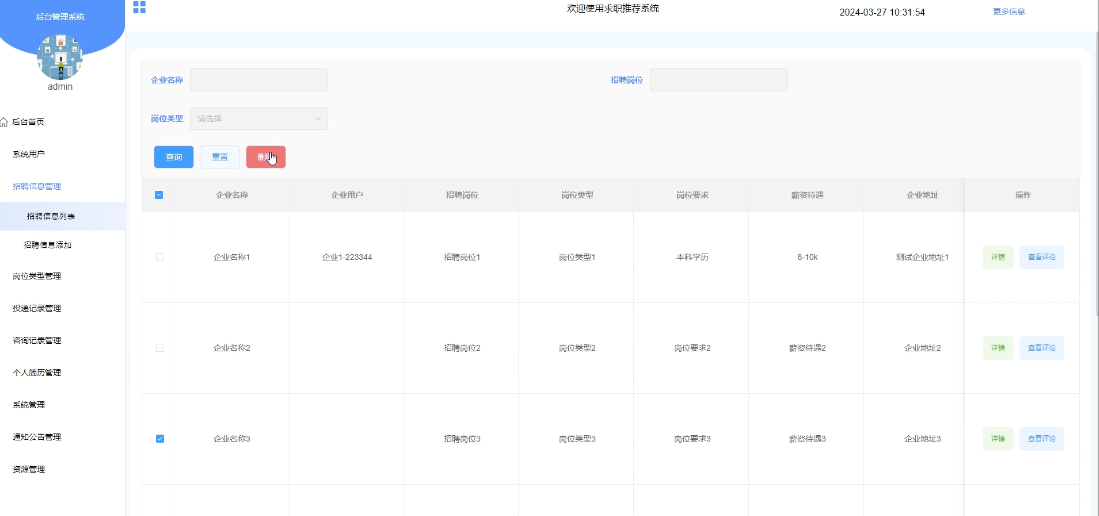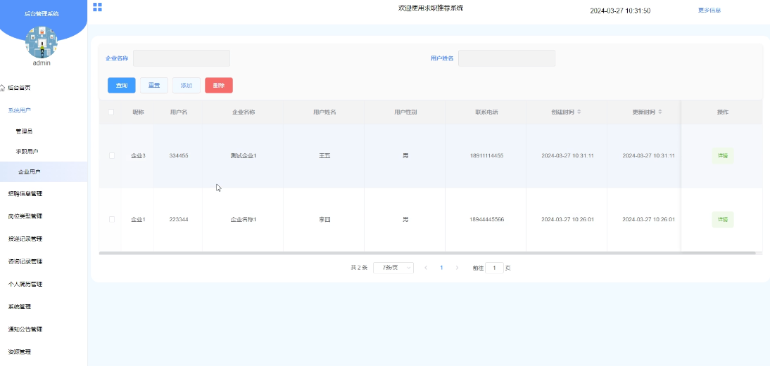 - 系统用户:管理员可以对求职用户、企业用户、管理员等系统用户信息进行增删改查操作。