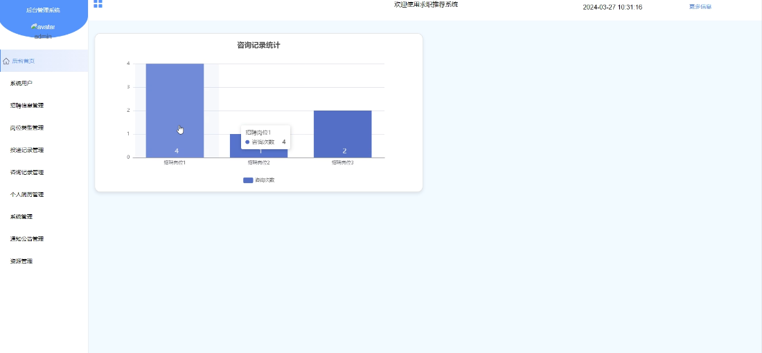 - 后台首页:管理员可以查看咨询信息统计数据分析图表。