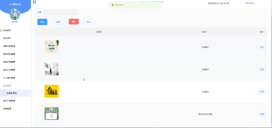 - 系统管理:管理员可以查看系统前台轮播图的详情信息,进行增删查操作。