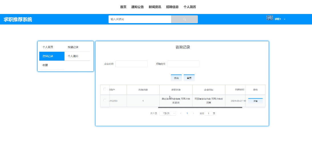 - 咨询记录管理:企业用户可以查看和管理求职用户提交的咨询企业信息,并对咨询进行回复。
