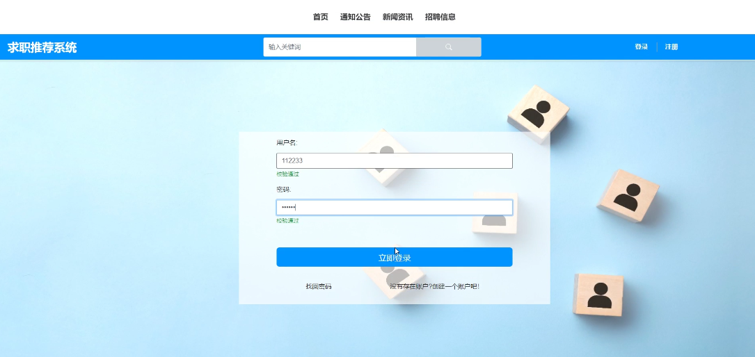 前台用户模块主要为求职用户模块,实现了用户注册、登录、首页、通知公告、新闻资讯、招聘信息、个人简历、我的账户、个人中心(个人首页、投递记录、咨询记录、个人简历、收藏)等功能。