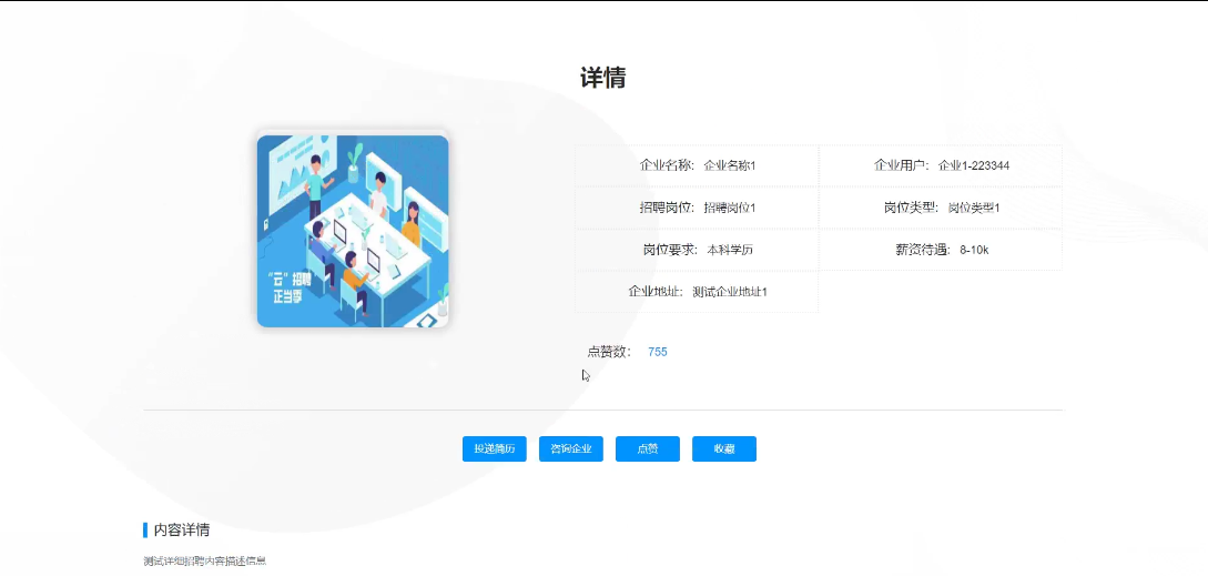 - 招聘信息:用户可以查看企业发布的招聘信息,可以查看某一求职招聘信息的详情,并可以进行投递简历和咨询企业操作。