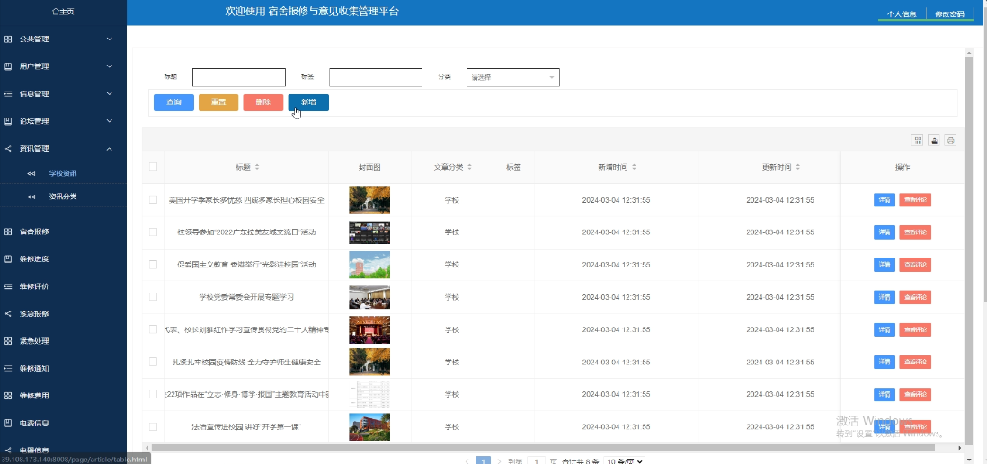 可对学校资讯和资讯分类进行管理,进行增删改查操作,学校资讯支持标题、标签、分类搜索,可点击查看详情(封面图、标题、分类、标签、描述、正文)和查看评论;资讯分类支持类型名称搜索,可点击查看详情。界面如下图所示。