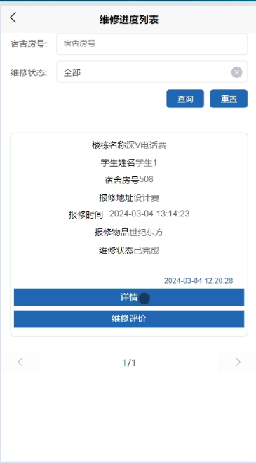 - 点击“维修进度”,可查看自己的所有维修进度信息,进行查询操作,支持宿舍房号、维修状态搜索,可点击查看详情,并可点击进行维修评价(评价分数、评价内容)操作。