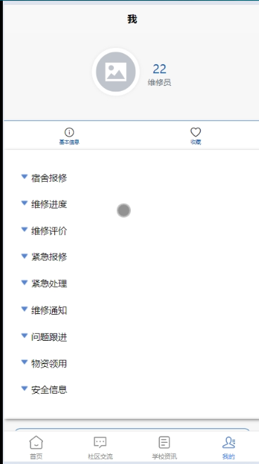- 我的:可对基本信息、收藏、宿舍报修、维修进度、维修评价、紧急报修、紧急处理、维修通知、维修费用、电费信息、电器预约等信息进行管控。具体如下: