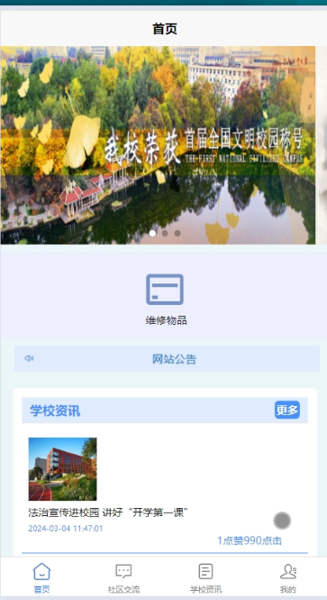 - 首页:可查看轮播图、维修物品、通知公告、学校资讯、维修物品推荐和其他系统功能。例如: