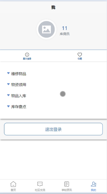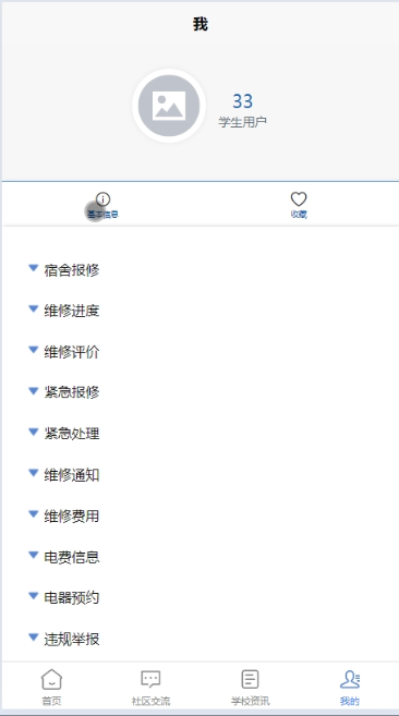 - 点击“基本信息”,可对个人信息进行管控,包括修改密码和修改资料(头像、昵称、邮箱等)。点击“收藏”,可查看所收藏的信息,包括社区交流、物品维修、学校资讯等信息,可进行增删除操作。