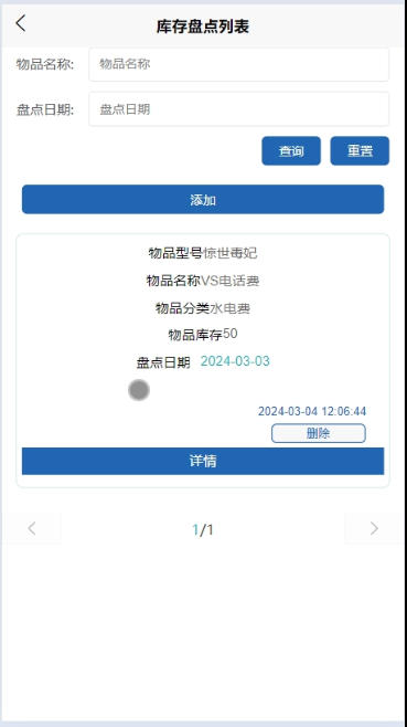 - 点击“物品盘点”,可查看自己的所有物品盘点信息,进行增改删查操作,支持物品名称、盘点日期搜索,可点击查看详情。