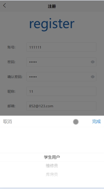可对学生用户、维修员、库房员和管理员进行管控,包括进行增删改查操作,点击可查看详情。