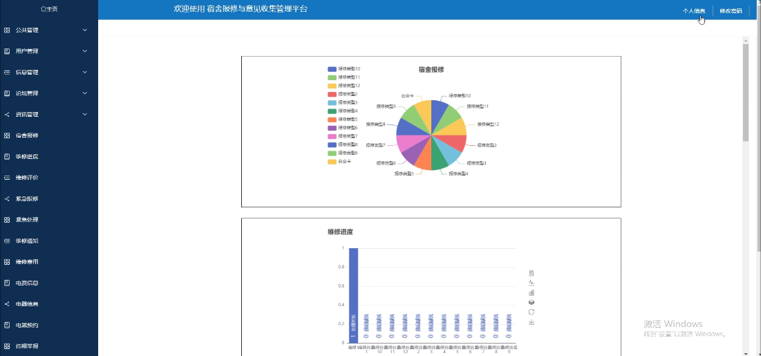 - 主页:可查看宿舍报修、维修进度、维修评价、维修费用、电器信息、物资领用等统计信息数据分析。