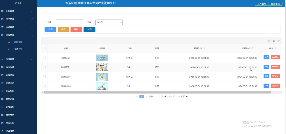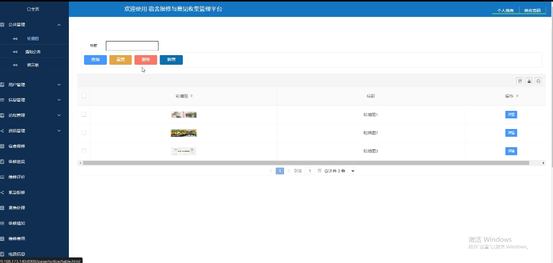 - 公共管理:可对轮播图、通知公告、留言板进行管理,轮播图和通知公告可进行增删改查操作,支持标题搜索,可点击查看详情;留言板,可进行查询和删除操作,支持标题搜索,可点击查看详情,并可点击回复操作。