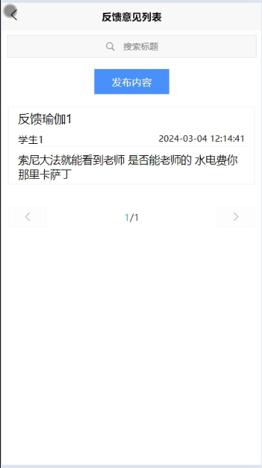 - 点击“反馈意见”,可查看自己的所有反馈意见信息,支持标题搜索,点击可查看详情,可点击发布内容(标题、留言内容)。
