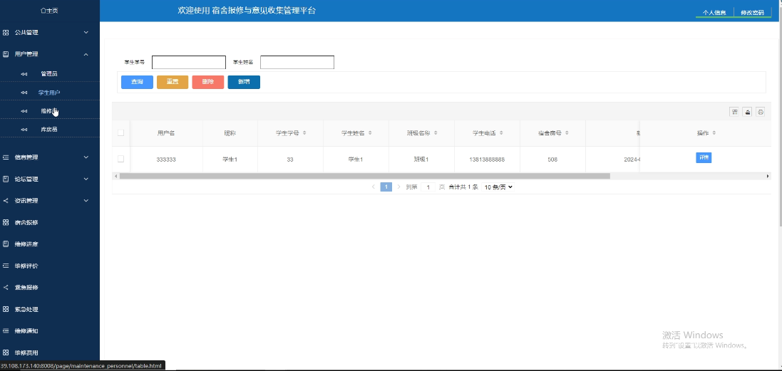 - 用户管理:可对学生用户、维修员、库房员和管理员进行管控,包括进行增删改查操作,点击可查看详情。