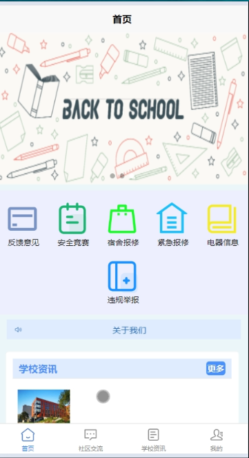 - 学校资讯:可查看管理员发布的所有学校资讯信息,支持搜索文章,点击可查看详情,进行点赞、收藏和评论。