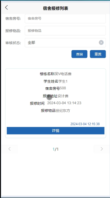 - 点击“宿舍报修”,可查看自己的所有宿舍报修信息,进行查询操作,支持宿舍房号、报修物品、审核状态搜索,可点击查看详情。