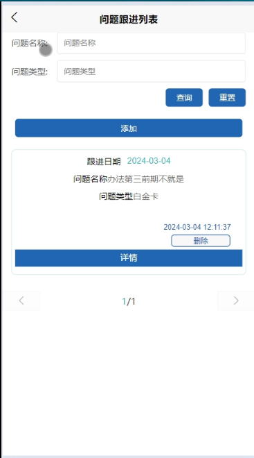 - 问题跟进:可查看的所有问题跟进信息,进行增改删查操作,支持问题名称、问题类型搜索,可点击查看详情。