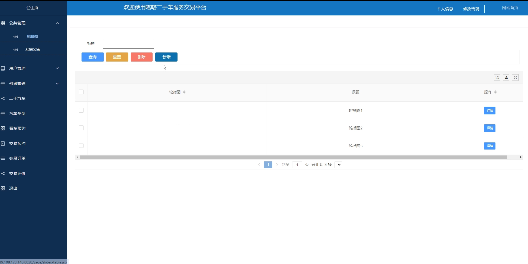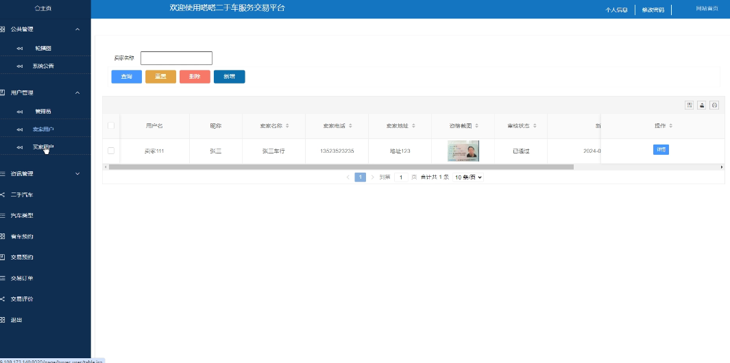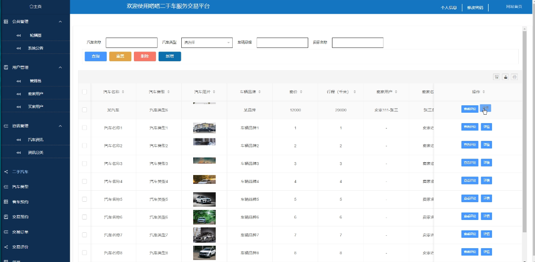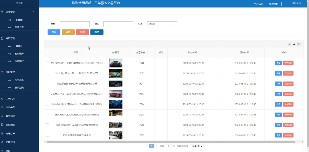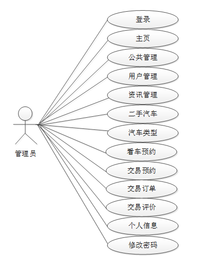 管理员模块主要负责管理平台上的主页、公共管理、用户管理、资讯管理、二手汽车、汽车类型、看车预约、交易预约、交易订单、交易评价等,可以进行新增、修改、删除、查询等操作,同时可以对系统账号的个人信息和密码进行管理。