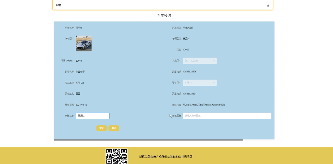- 可以在看车预约,查看自己提交的看车预约详情信息,并对看车预约信息进行审核和回复。