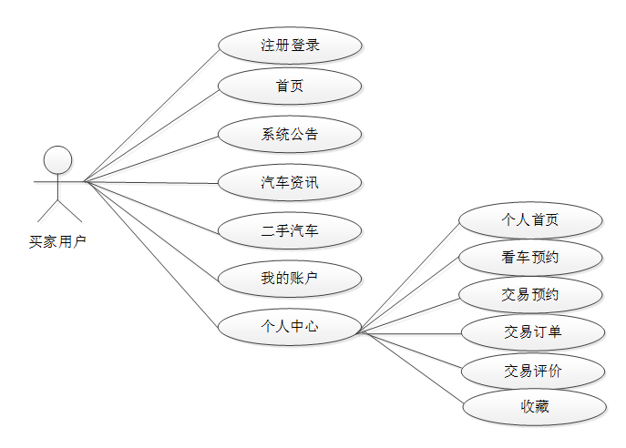 其中买家用户模块主要实现买家用户的注册登录,能够查看前台首页、系统公告、汽车资讯,以便及时了解相关系统信息和最新汽车市场情况,可以搜索和浏览二手汽车信息,实现预约看车和预约交易操作,并可在个人中心的交易单进行支付,完成交易;并对自己的个人首页、看车预约、交易预约、交易订单、交易评价等信息进行管理。