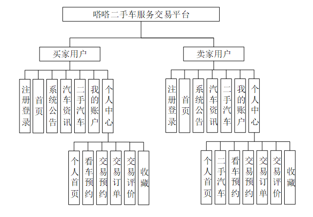 根据嗒嗒二手车服务交易平台功能需求分析,主要划分为了买家用户模块、卖家用户和管理员模块这三大模块。具体如下: