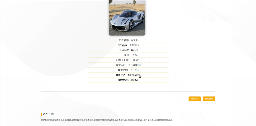- 二手汽车:买家用户可以在二手汽车模块查看发布的所有二手汽车信息,包括汽车名称、汽车类型、汽车类型、卖价、行程、卖家用户、卖价电话、卖家地址、汽车介绍等详细信息,可以对在相关二手汽车下进行评论,并且用户可以实现预约看车和预约交易操作,填写相关信息进行提交。同时,可以通过汽车名称、汽车类型、汽车类型、卖家名称进行搜索,并同搜索条件下对比信息。