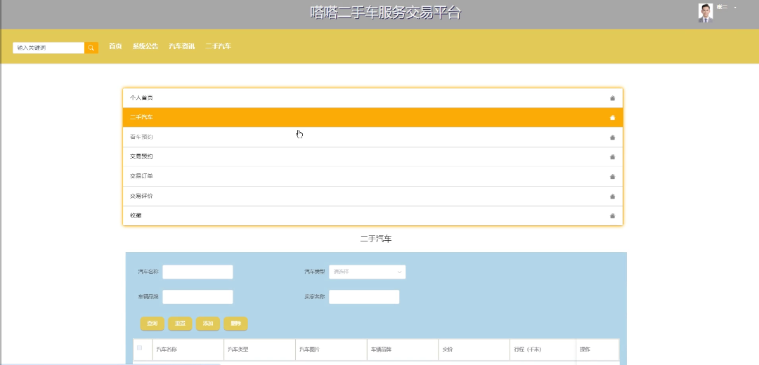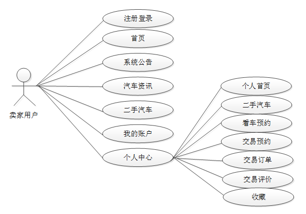 - 个人中心:卖家用户可对个人中心进行管控,包括个人首页、二手汽车、看车预约、交易预约、交易订单、交易评价、收藏等功能。例如: