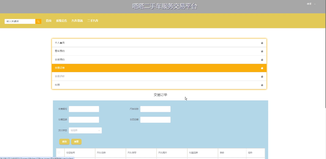 - 交易订单:管理员可以管理所有交易订单信息,可以通过汽交易编号、汽车名称、车辆品牌、交易日期搜索提交的所有交易订单信息,查看交易评价,以便能及时调整升级系统和管理卖家二手车交易信息,修改支付状态,以确保交易顺利完成。