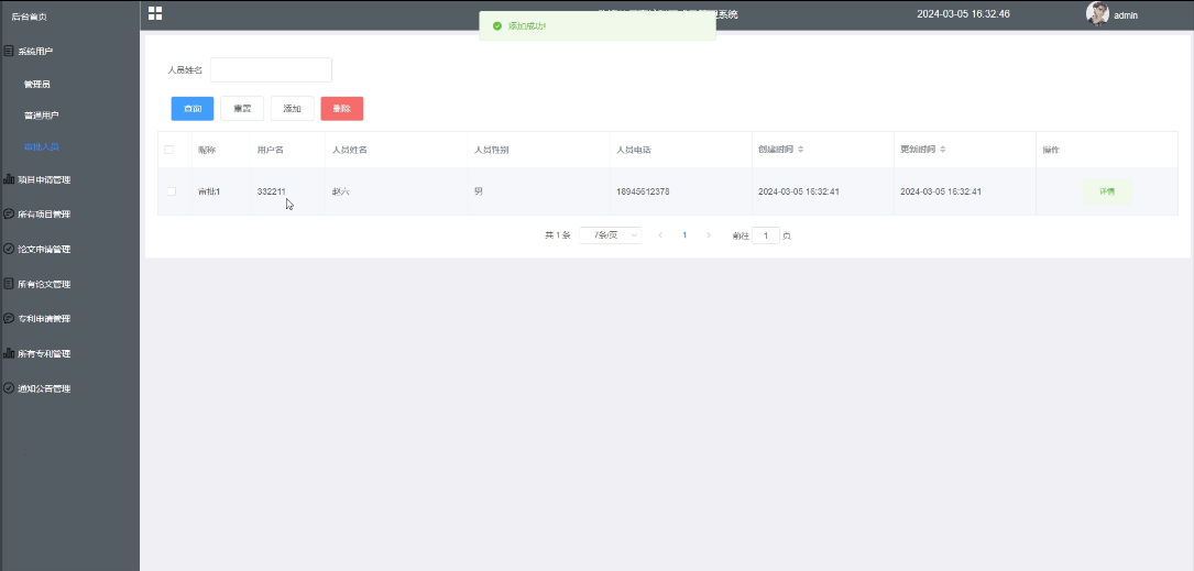 - 项目申请管理:可查看所有提交的项目申请信息,进行增改删查操作,支持项目名称、项目类型、审核状态搜索,可点击查看详情(项目名称、项目编号、项目类型、立项时间、计划结语、申请经费、普通用户、用户姓名、学院名称、参与人员、项目详情、项目文档、项目进度、审核状态)和进行审核,并可点击进行公布操作。