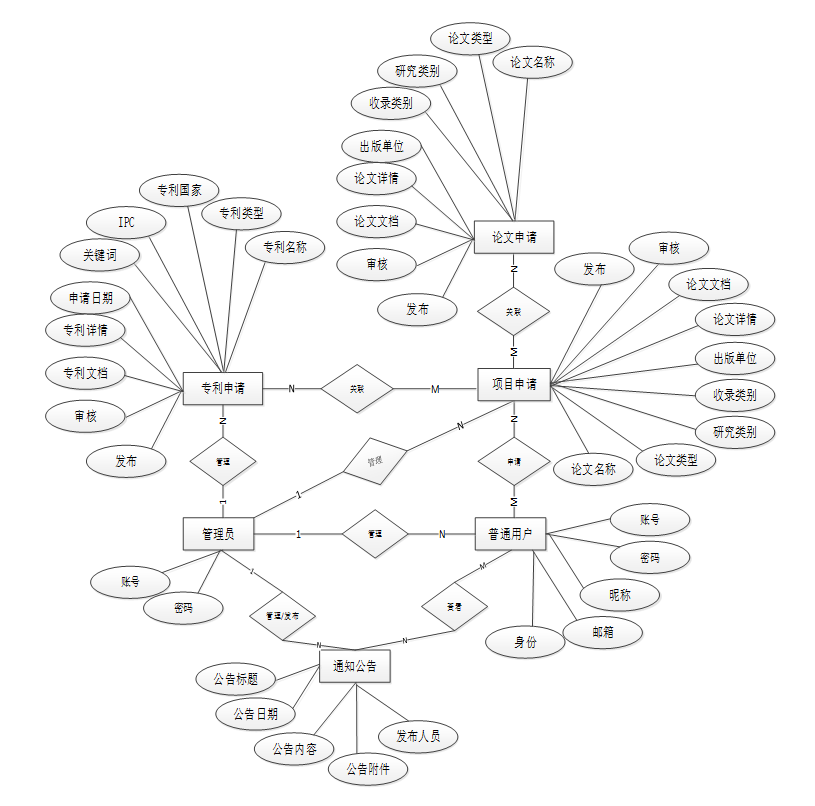 下面是整个高校科研成果管理系统中主要的数据库表总E-R实体关系图。