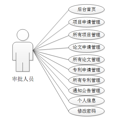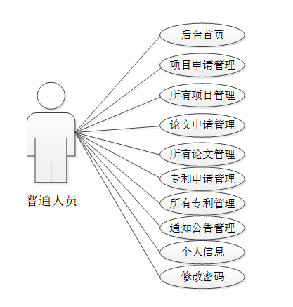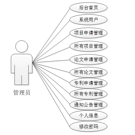 通过2.3功能的分析,得出了本高校科研成果管理系统的用例图: