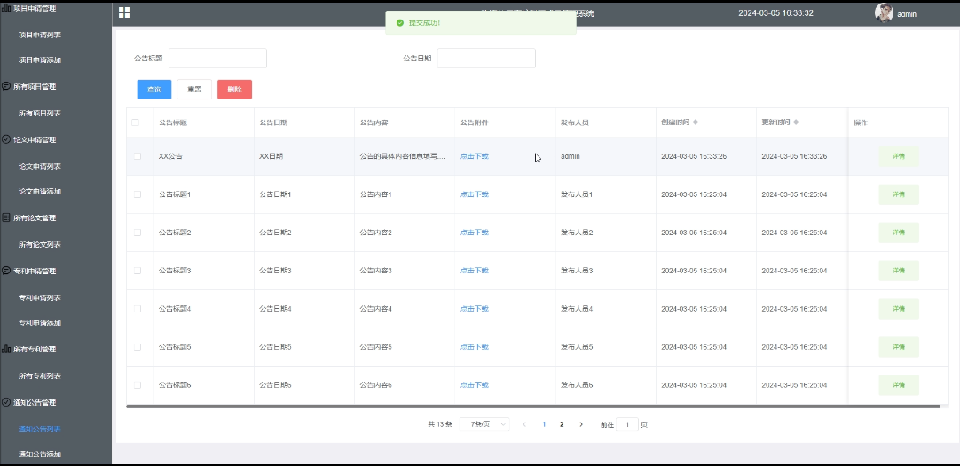 该系统可以通过在线平台提供项目申请管理 所有项目管理、论文申请管理、所有论文管理、专利申请管理、所有专利管理、通知公告管理等功能,能够使用户可以方便地查找符合自己需求的信息,并实现线上申请项目、论文和专利的操作。同时,通过系统,管理员和审批人员可以简化高校科研成果管理流程,提供在线审核和发布项目、论文和专利等科研成果,并减少繁琐的手续和文件存档。