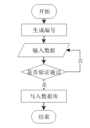 用户成功登入系统后就能够实现增加数据的操作,增加数据的编号由系统生成,用户不能随意填写,除了编号以外,其他增加信息用户自己填写,填写后的信息经过系统验证,验证通过后即可完成数据新增,数据新增的流程图如下图2-1所示。