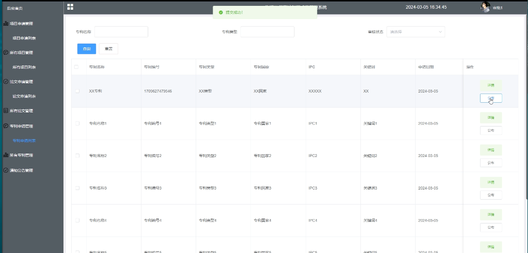 - 所有专利管理:可查看所有专利信息,进行查询操作,支持专利名称、专利类型、批准日期搜索,点击可查看详情。