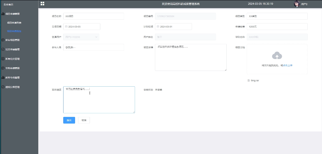 - 项目申请管理:可查看提交的项目申请信息,进行增改删查操作,支持项目名称、项目类型、审核状态搜索,添加提交项目申请信息(项目名称、项目类型、立项时间、计划结语、申请经费、参与人员、项目详情、项目文档、项目进度)等待审核,可点击查看详情。
