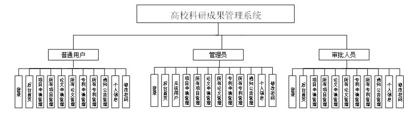 根据用户对系统的需求,要求系统简单操作,能够准确,完整的对信息进行管理。对高校科研成果管理做需求做解析后,划分为了普通用户、审批人员和管理员这三大功能板块。