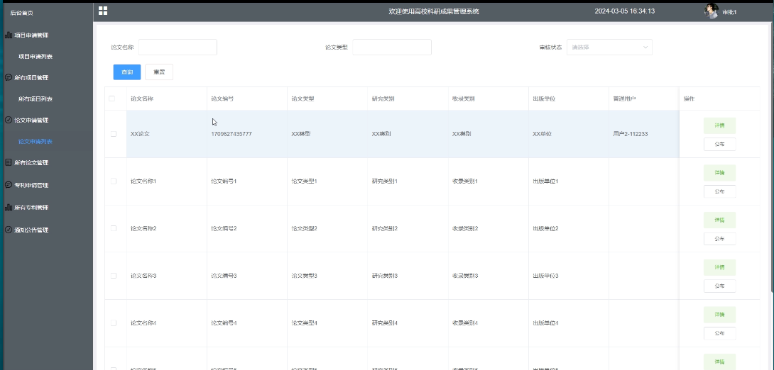 - 论文申请管理:可查看所有提交的论文申请信息,进行增改删查操作,支持论文名称、论文类型、审核状态搜索,可点击查看详情(论文名称、论文编号、论文类型、研究类别、收录类别、出版单位、普通用户、用户姓名、学院名称、论文详情、论文文档、审核状态),并可进行公布操作。