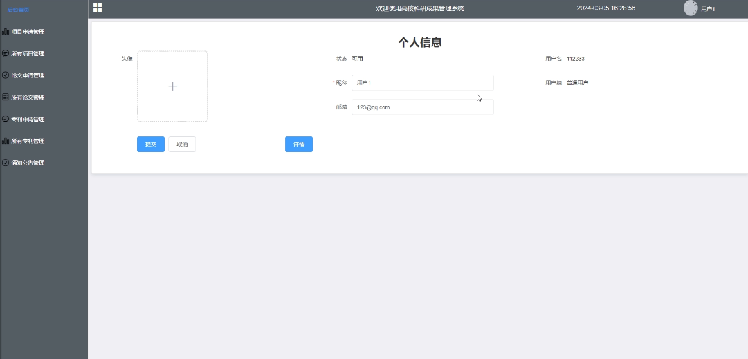 - 系统用户:可对普通用户、审批人员和管理员进行管控,包括进行增删改查操作,点击可查看详情(头像、账号、密码、昵称、邮箱、状态、姓名、性别、电话)。
