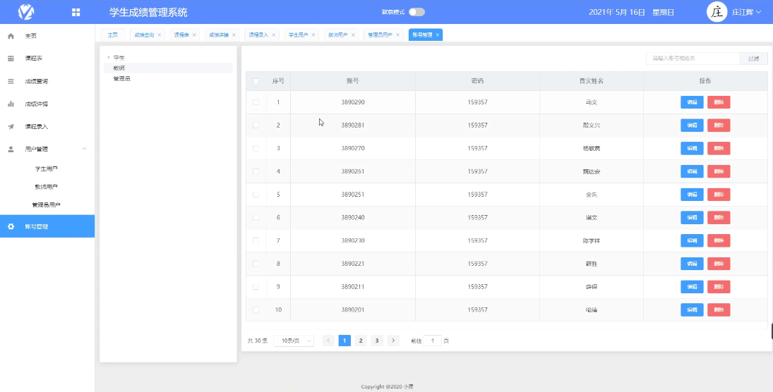 - 账号管理:可对所有用户账号(学生、教师、管理员)进行管理,点击“学生”,可对各课程的账号、密码、真实姓名等信息新增、编辑、删除操作,支持账号、姓名搜索;点击“教师”,可对账号、密码、真实姓名等信息新增、编辑、删除操作,支持账号、姓名搜索;点击“管理员”可对账号、密码、真实姓名等信息新增、编辑、删除操作,支持账号、姓名搜索。