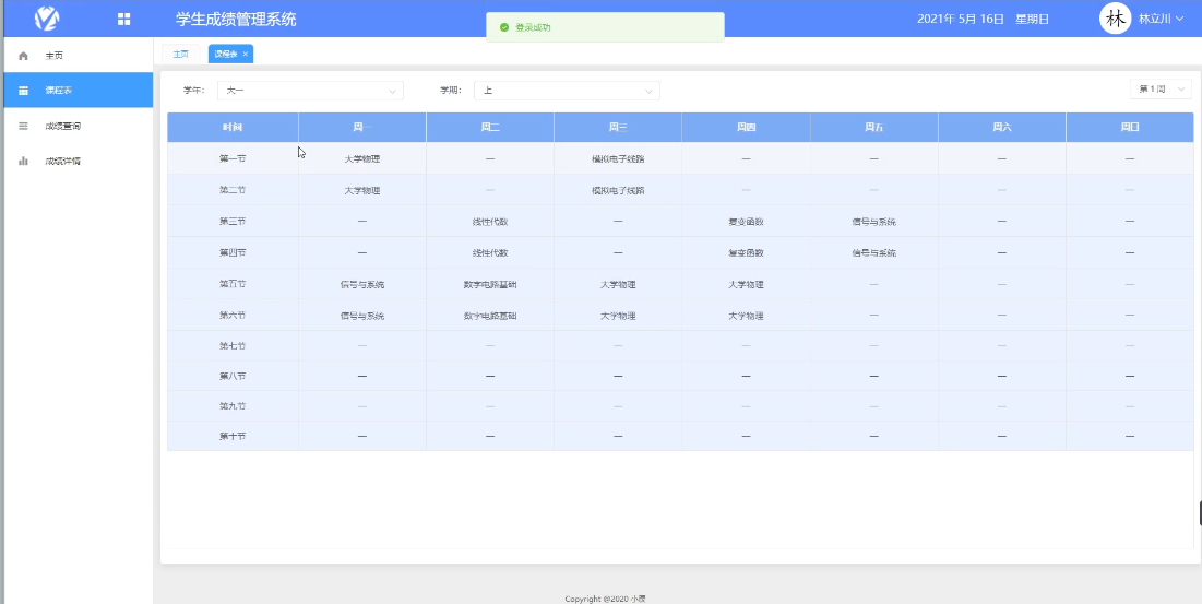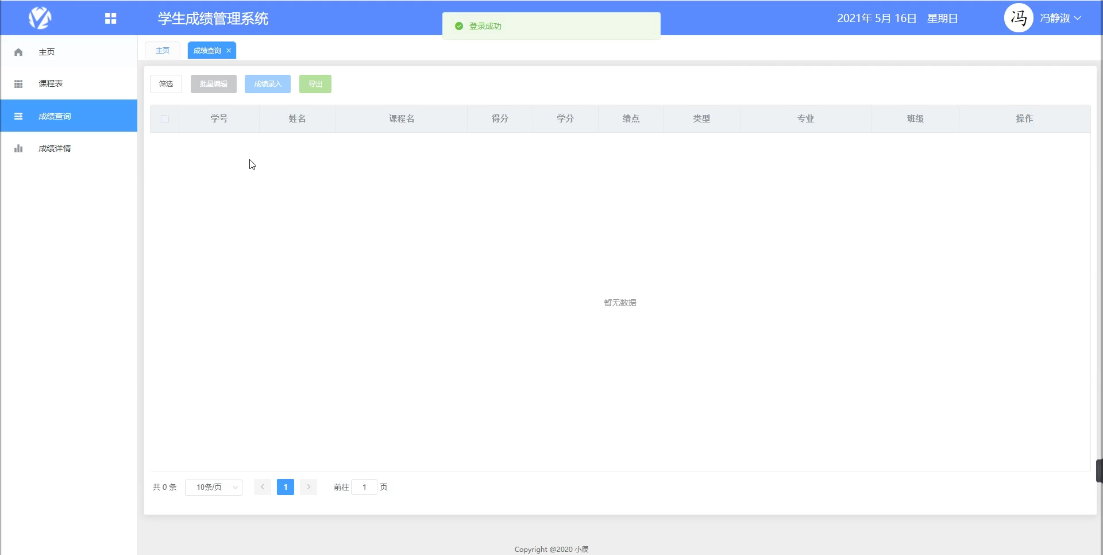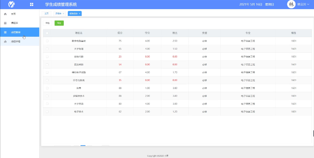 - 成绩查询:可查看自己的成绩查询信息,进行筛选、导出操作,可查看详情(课程名、得分、学分、绩点、类型、专业、班级)。