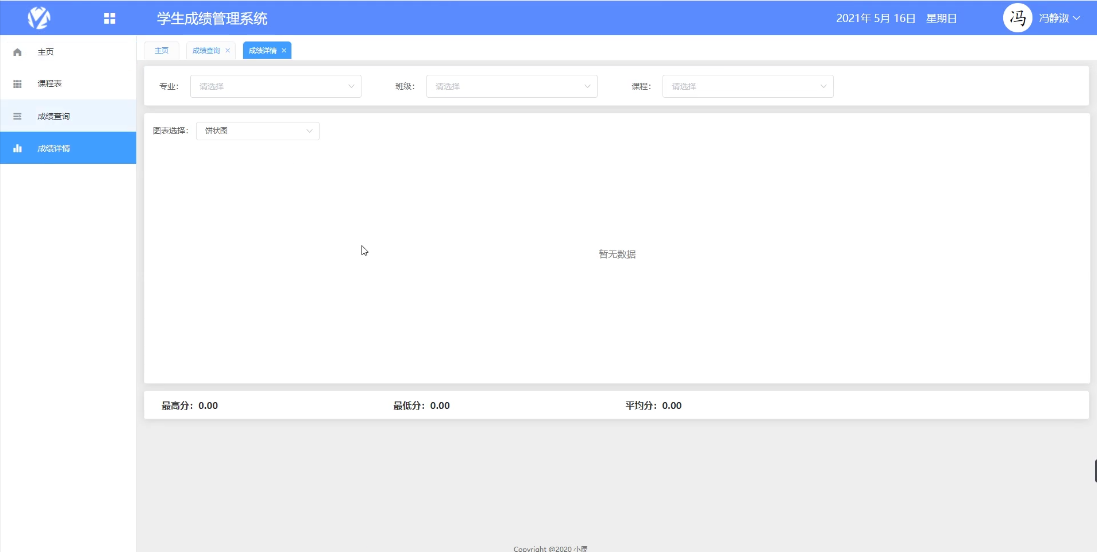 - 成绩详情:可查看所有成绩详情消息,包括成绩详情图表信息(优秀、及格、不及格占比)和最高分、最低分、平均分,可选择图表形式,支持专业、班级、课程搜索。