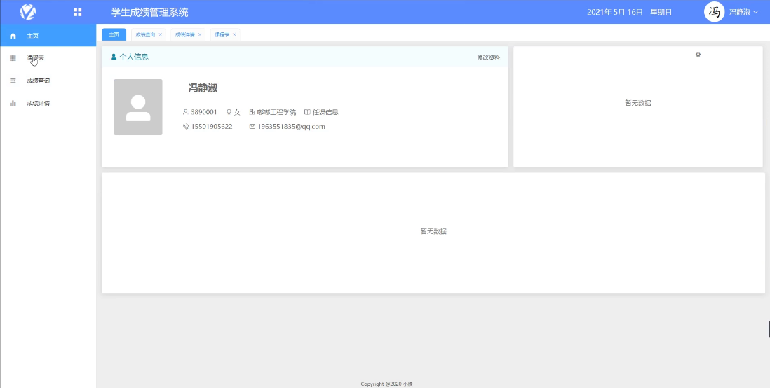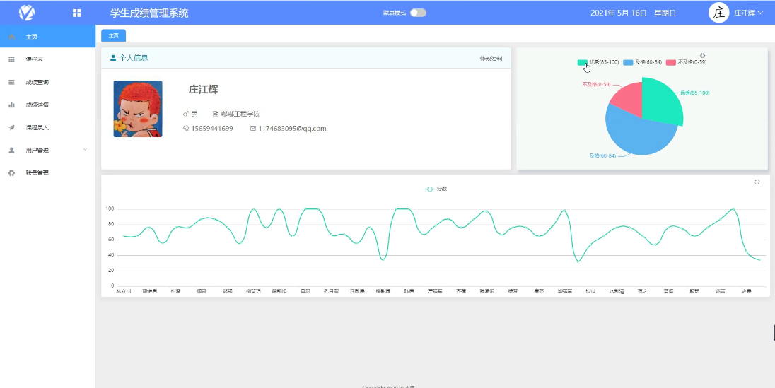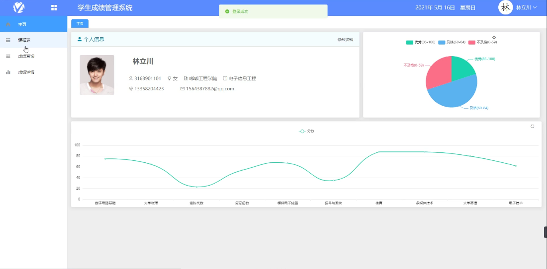- 主页:可查看个人信息、和分数统计、各课程成绩详情数据分析图表,点击“个人信息”设置按钮,可对个人信息进行(学号、姓名、学校、性别、专业、班级、电子邮箱、手机)进行管理。