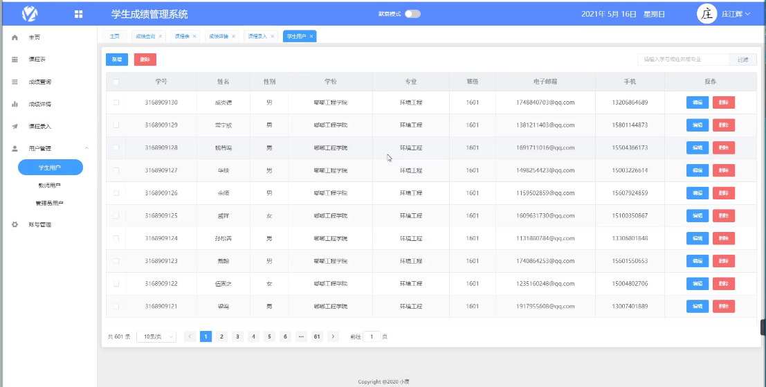 可对所有用户(学生用户、教师用户、管理员用户)进行管理;点击“学生用户”可进行新增、删除、编辑操作,支持学号、姓名、专业搜索;点击“学教师用户”可进行新增、删除、编辑操作,支持编号、姓名搜索,可点击任课信息,对任课信息(序号、专业、班级、学期、课程)进行管理;点击“管理员用户”可进行新增、删除、编辑操作,支持编号、姓名搜索。其界面如下图所示。
