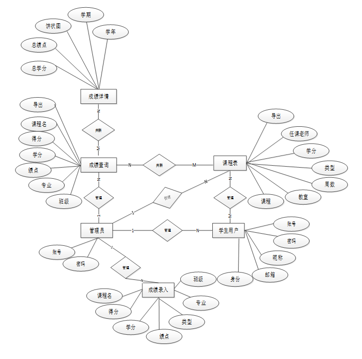 下面是整个成绩管理系统中主要的数据库表总E-R实体关系图。