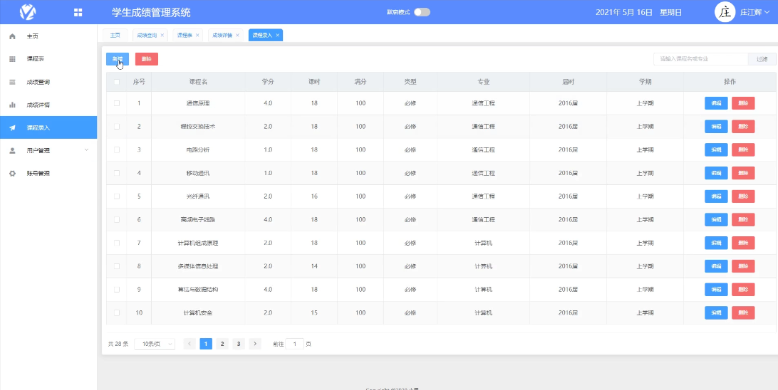 - 课程录入:可查看所有课程录入消息,进行新增、删除、编辑操作,支持课程、专业搜索,点击新增,可进行课程信息录入(课程名、学分、满分、届时、学期、专业、类型)。