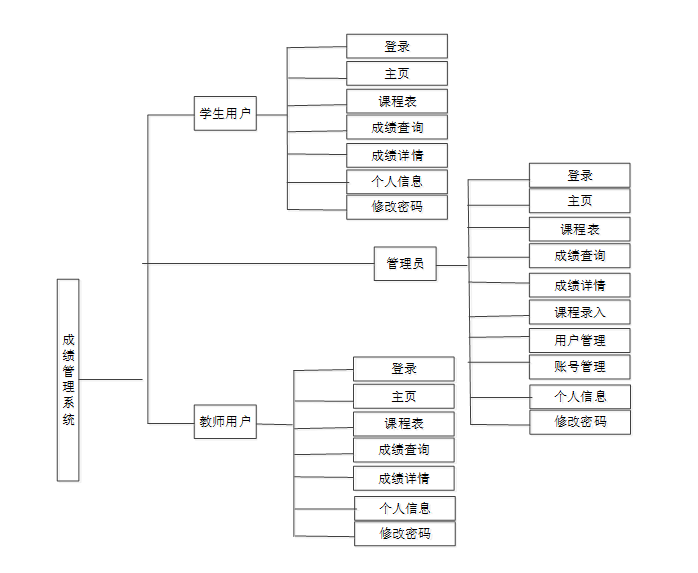 根据用户对系统的需求,要求系统简单操作,能够准确,完整的对信息进行管理。对成绩管理做需求做解析后,划分为了学生用户、教师用户和管理员这三大功能板块。